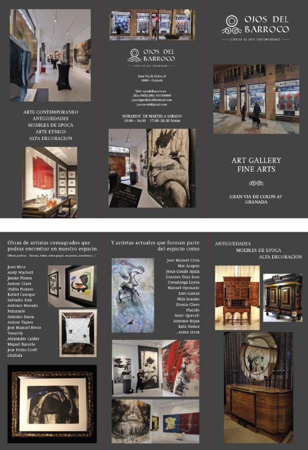 Damos la bienvenida al proyecto “Ojos del barroco”, arte contemporáneo y antigüedades en Granada, caracterizado por la calidad artística de nuestros autores y la variedad de estilos (abstracto, cinematográfico, pop art, figurativo, OP-ART, arte conceptual); mantiene un lugar privilegiado con los artistas más importantes del panorama nacional e internacional, como Joan Miró, Pablo Picasso, Antoni Tàpies, Vasarely, Jaume Plensa, Alexander Calder, Basquiat, Toko Shinoda y Mar Aragón.