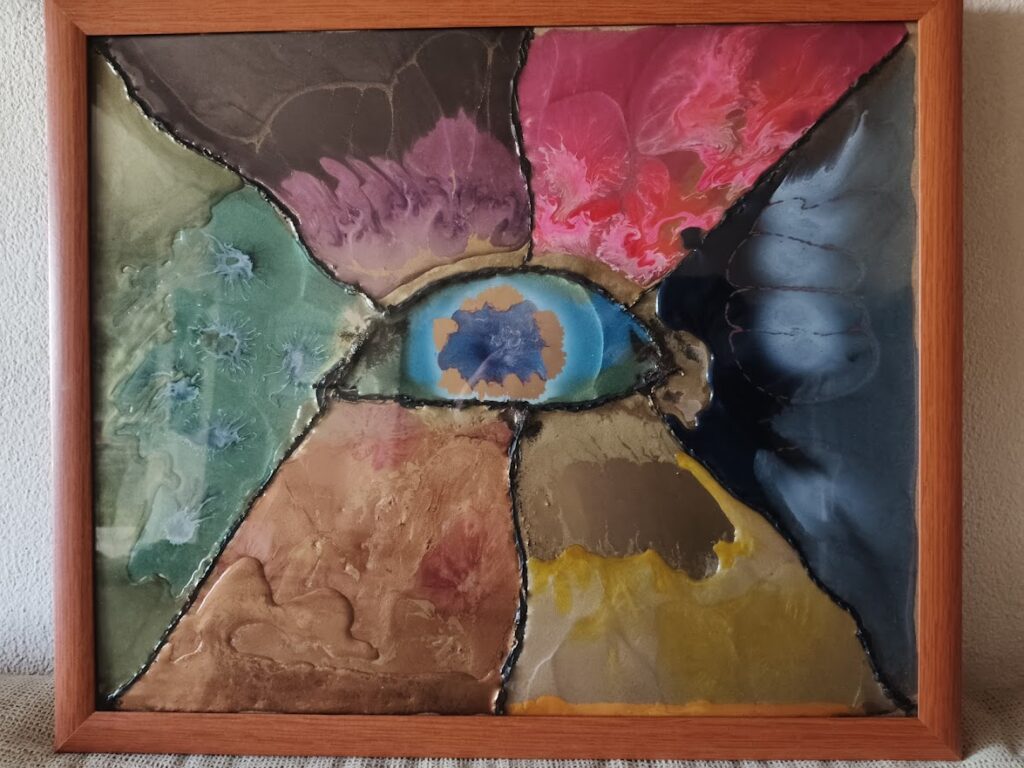 Realizado en vertido de resinas, acrílicos y complementos, representa todos los ecosistemas vigilado por el ojo de la madre naturaleza.